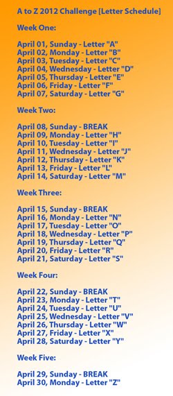 ![A to Z 2012 Challenge [Letter Schedule] - web](https://kirstyes.co.uk/wp-content/uploads/2012/01/a-to-z-2012-challenge-letter-schedule-web.jpg?w=604)