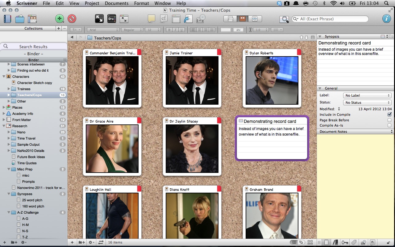 You can add in footnotes, comments, overall project notes – in fact you can pretty much scribble what ever you like to help you keep track of what you need to do, change etc. Use the little record cards to write summaries/POV etc too.