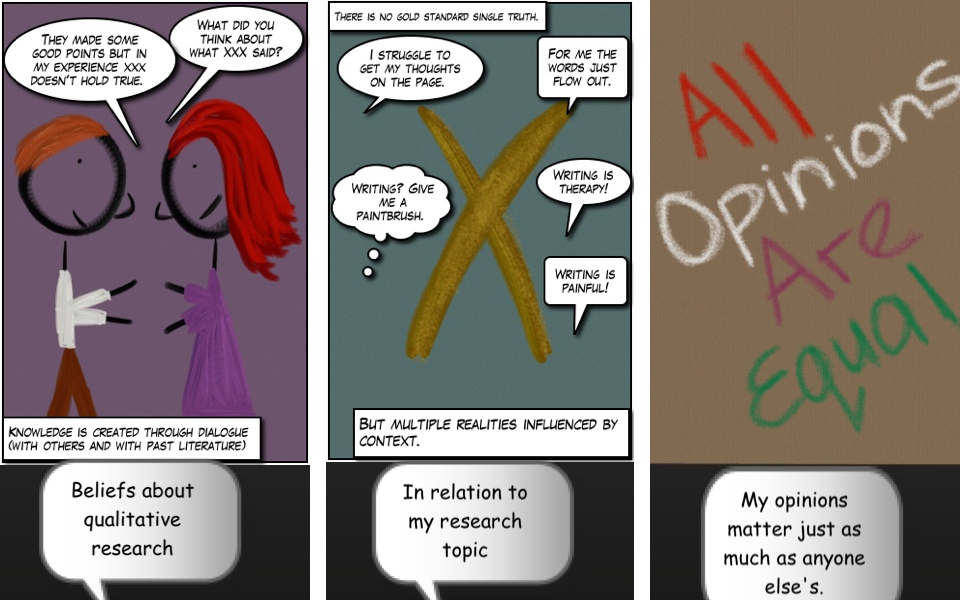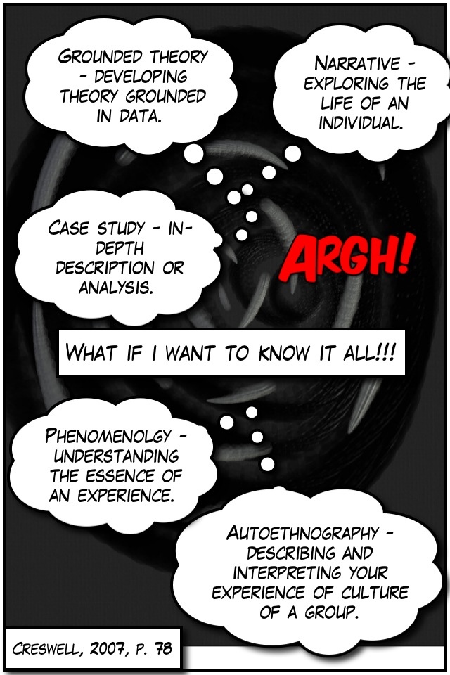 Inspired by the wonderfully talented and creative Gillian Crossley I have used ArtSet and some comic apps to create a little comic on my current views on qualitative research to help me make sense of my philosophy when selecting a research methodology (which I seem to be going round in circles with).