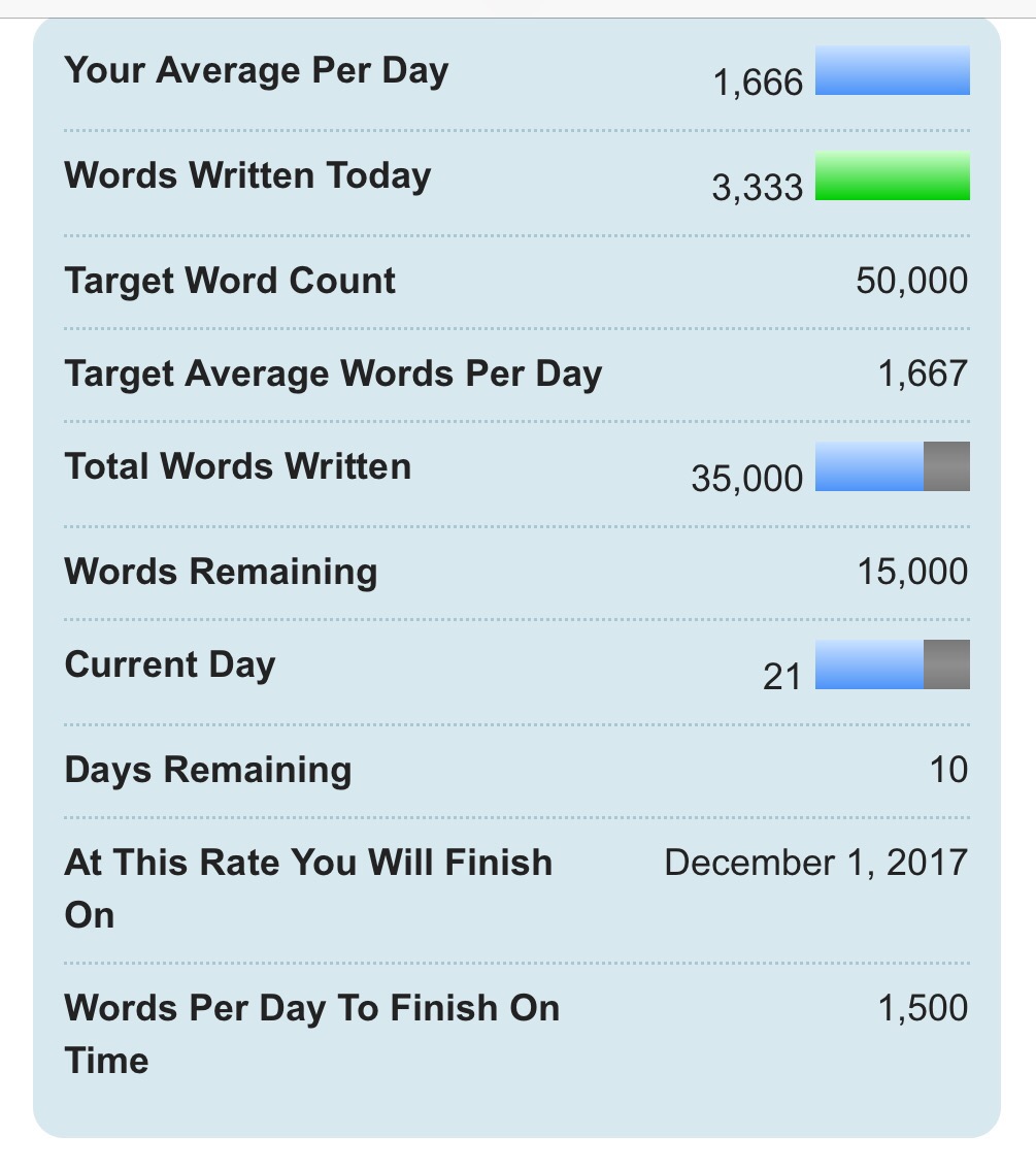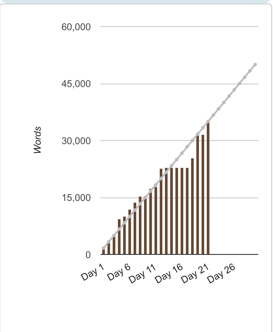 As of Tuesday night when writing this I have 35,000 words so 15,000 to go. I have a couple of train journeys over the next two days so hoping to reach 40,000 if I can.
