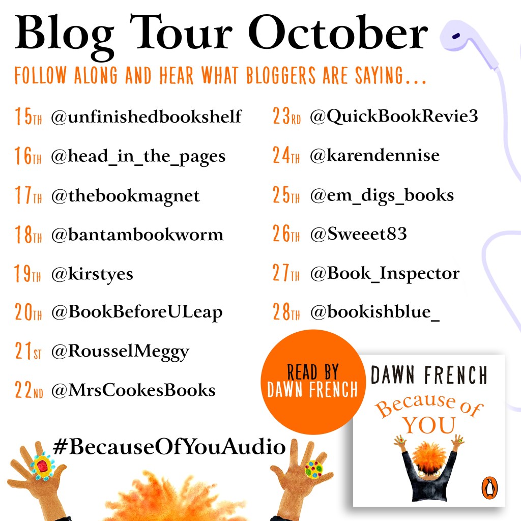 To be in with a chance of winning an audiobook copy of Because of You by Dawn French finish the sentence Because of You, I… and share the blog tour poster using #BecauseofYouAudio, and tag in me @kirstyes and @penguinbooksuk. I will randomly pick the #giveaway winner on Wednesday 21st 2020.