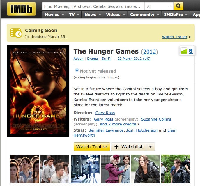 I use this on almost a daily basis I think. I’m a huge TV and film fan and use it to find out the name of films, titles of episodes of TV series I watch, etc. etc. Here is the homepage for the film I am most looking forward to this year after reading the books over Christmas. I also found out a useful tip from a mummy friend that I will be using when I have kids – a parent’s guide that warns you about things like Santa’s secret being revealed or in the case of The Hunger Games that a boy and girl sleep in a sleeping bag together (and that there are lots of violent deaths!!).