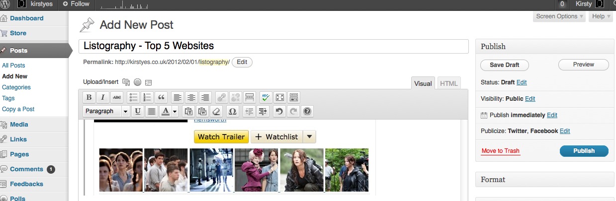 This is what is behind the scenes here – here is a screenshot of this very post being written in fact. I’m not actually on here as much as sometimes I’d like – I often have spates of blogging frequently (usually when I have time to schedule posts) but try to participate in #SilentSunday – a weekly picture with no writing, these Listographies (when I can cope with just 5 options and have the time), and I’m going to be posting during April for the A-Z challenge. I also have a couple of private wordpress blogs that I plan to use for professional and PhD related reflection.