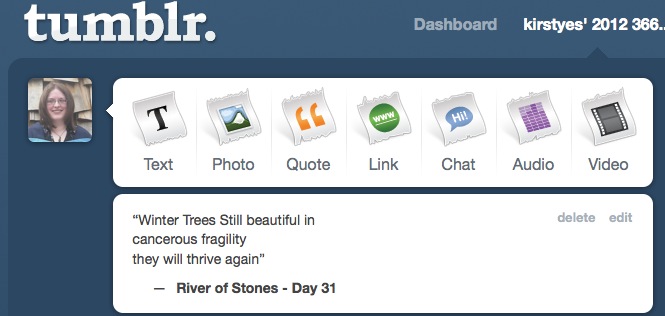 This year I have taken on the challenge of taking a photo a day and writing a small stone (mindful reflection) and decided to set up a Tumblr blog to a) try another platform and b) not annoy regular followers here that might not want 2 daily posts from me. I’ve found a few random Tumblr blogs I now follow and reblog some of their things – mainly Harry Potter related.