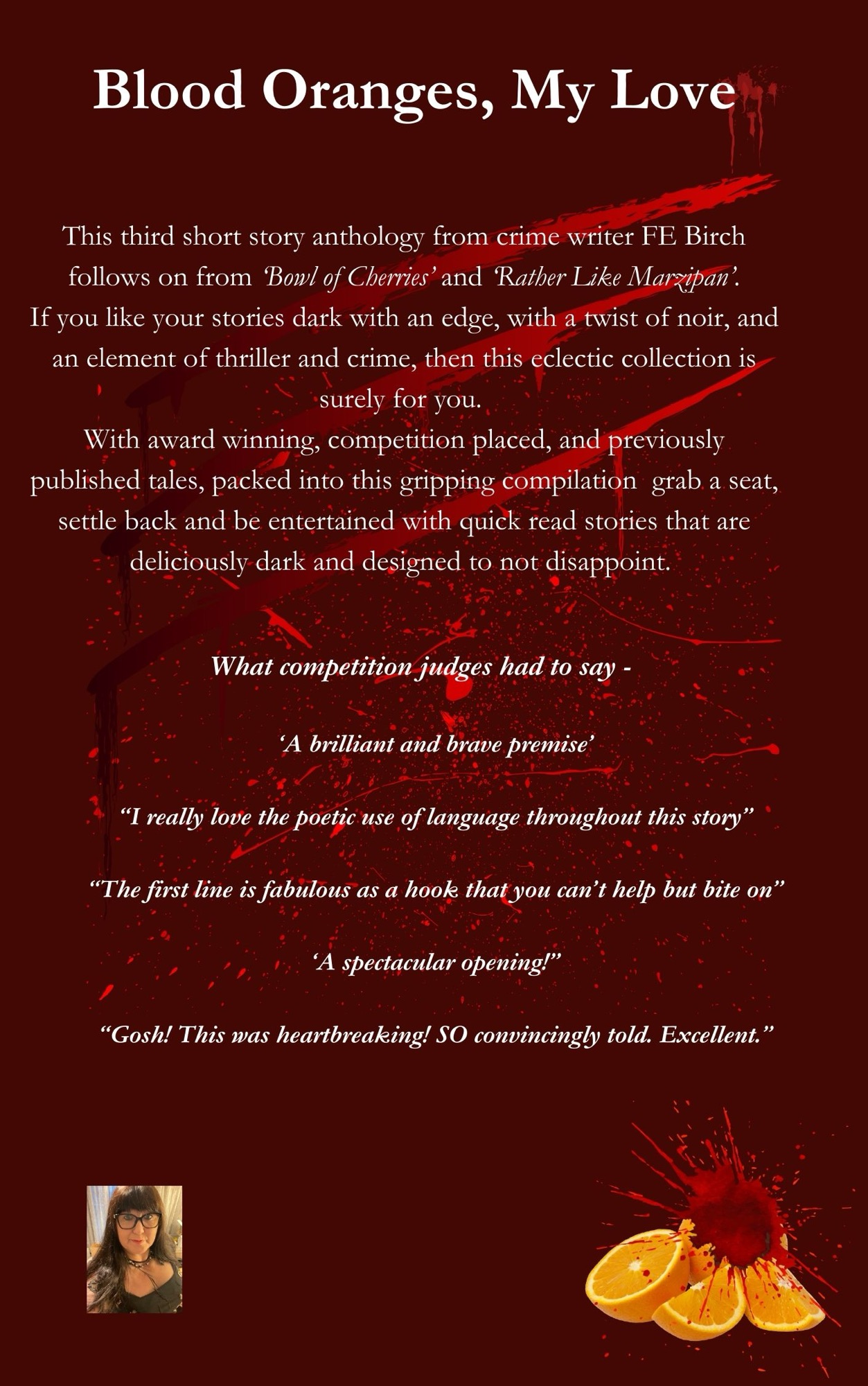Blood Oranges, My Love is the final anthology of dark crime reads from F.E. Birch following on from Bowl of Cherries and Rather Like Marzipan. Most of the stories have been placed in competitions or previously published and span from 2006 – present. They are quick reads and contain criminally insane themes involving family drama, fraud, childhood memories and trauma, bereavement, grooming, alcoholism, spontaneous combustion, ghost stories, disability, and a bit of vengeful murder. There’s also a handful of lighter, kinder, more upbeat reads, should you wish to find them.