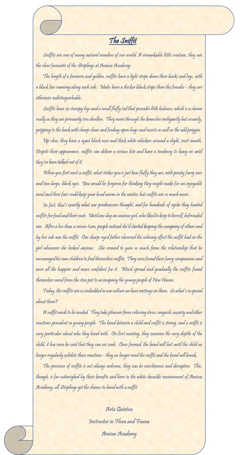 Sniffits are one of many natural wonders of our world. A remarkable little creature, they are the clear favourite of the Striplings at Amicas Academy.