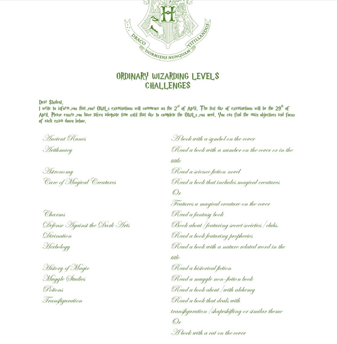 Based on the Harry Potter classes for the Ordinary Wizarding Level Exams this is a reading challenge to sit and pass your OWLs. There are 12 categories. You can only move onto NEWTs in August for categories whose OWL you have passed. You only need to pass 5 for an outstanding grade. I’ve done one already. 😋