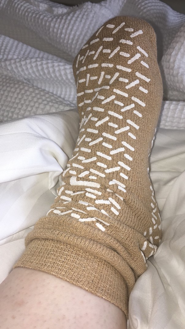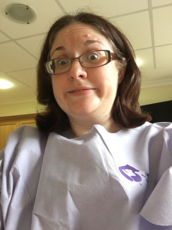 I was also given a very fetching outfit of a purple one use gown, nude slipper socks, a dressing gown, and one use knickers that I promptly stuck my finger through when pulling up. I knew they’d pretty much rip them off to access my lady parts later so I wasn’t too worried about that. (In preparation I had re-shaved my lower legs and I had trimmed a little a few days before but hey I’m single and can’t be bothered with having unnecessary itching going on down there!!).