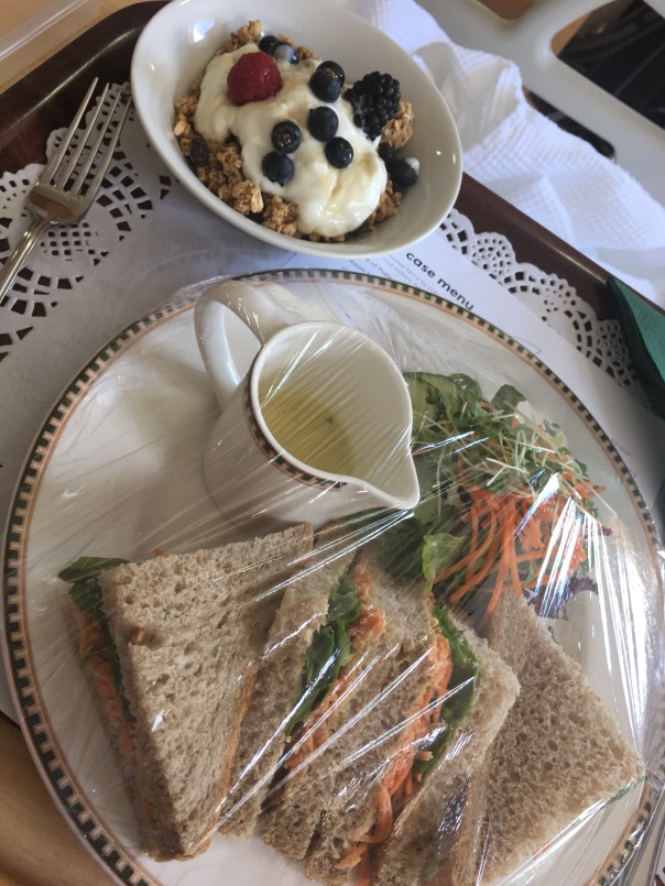 Then I wolfed down my food and a few glasses of water and the tablets I’d been unable to take in the morning. I let dad have the tea they bought. Didn’t fancy any milk. I had carrot and hummus sandwiches and granola with yoghurt and berries. It was actually tasty – or was I just starving.