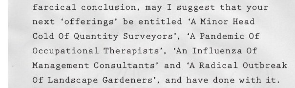 This is a sizeable tome at just under 400 pages and lays out letters from the Philpotts to various pop stars, some responses in kind and a few shorter ‘postcard’ style quips that have yet to be responded too. This last style was generally more puntastic and therefore appealed to my sense of humour. I think the B52s Love Shack ‘floozy hovel’ letter was my favourite.